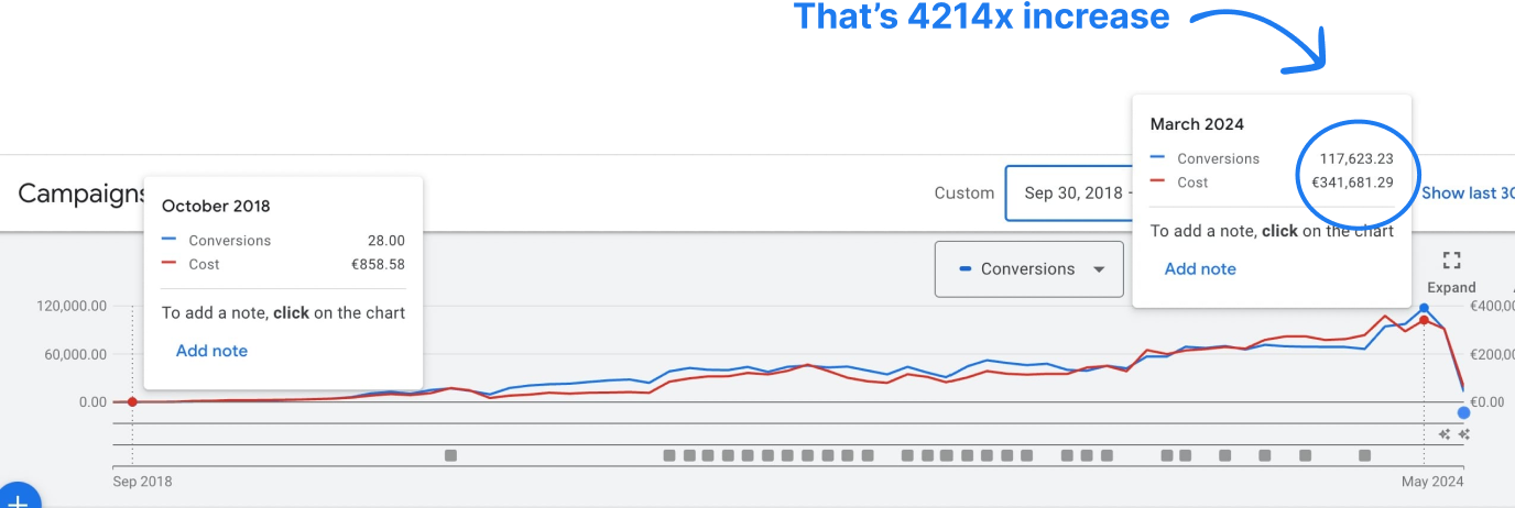Norėdamas išplėsti kampanijas visose šalyse, dirbau ne tik su „Google Ads“ kampanijomis, bet taip pat testavau daugybę nukreipimo puslapių. Tai leido išlaikyti žemą CPA – mažesnį nei 5 $. Tai būtina, bet dažnai pamirštama bet kurios „Google Ads“ kampanijos dalis.