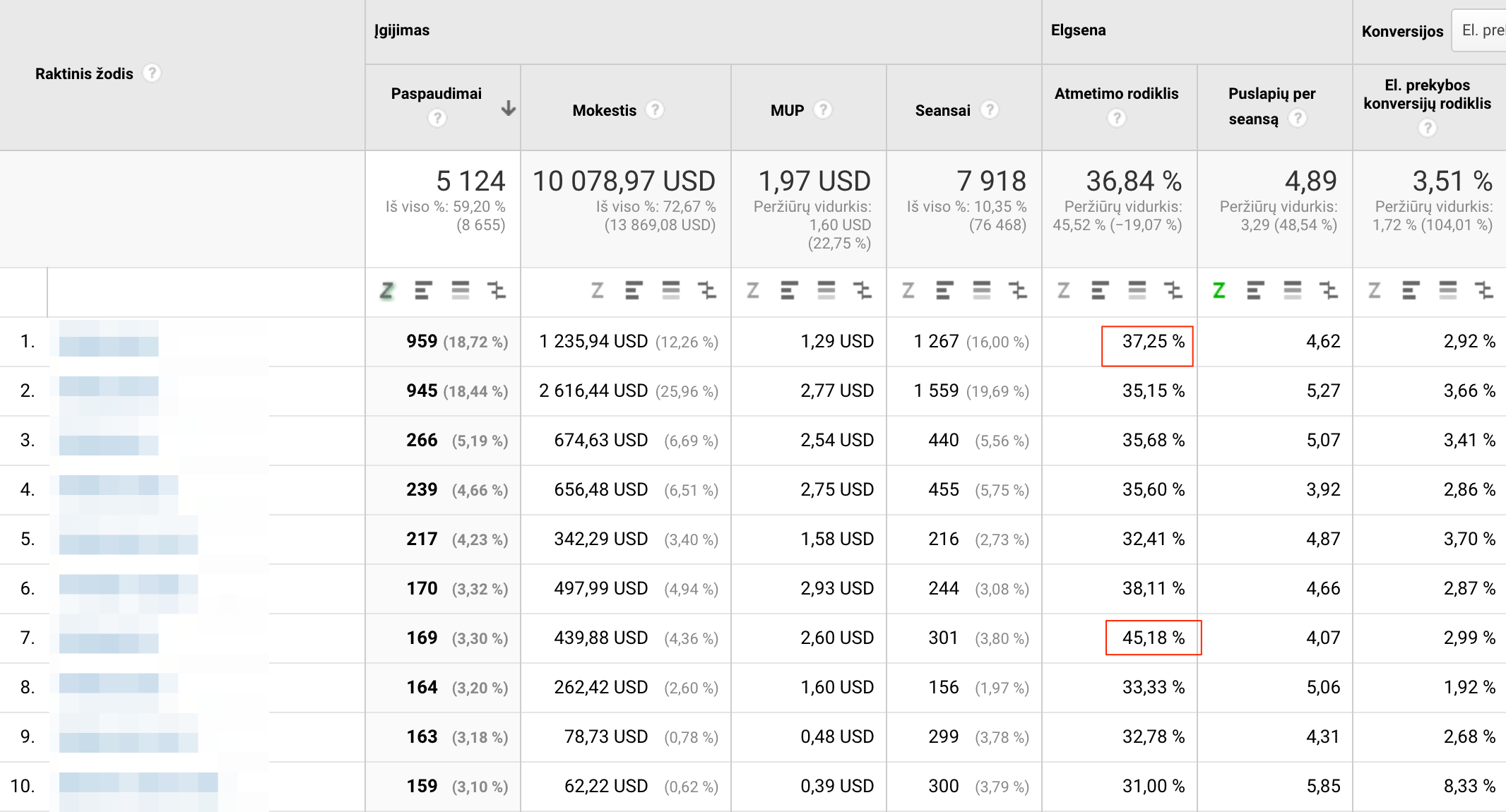 Aišku, visada pradėkite nuo aukščiausio atmetimo rodiklio. Kadangi matote konkretų raktinį žodį, tai jums bus gan paprasta suprasti ar vartotojas atėjęs į jūsų svetainę rado ko ieškojo. Gal jūs jį nukreipiate ne ten kur reikia? O gal tiesiog pats raktinis žodis nėra tinkamas? Pasistenkite įsijausti į vartotoją ir suprasti kokios informacijos jis nori matyti.