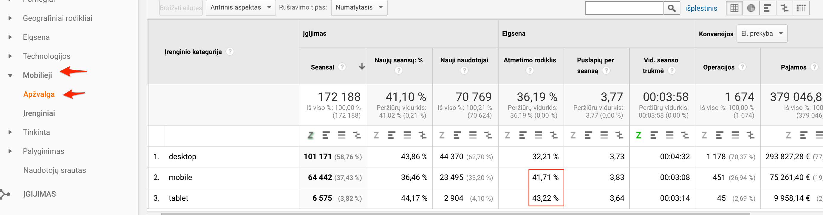 Jei suprasite, kad mobilaus srauto atmetimo rodiklis didelis, tai kaip ir su naršyklėmis, turite iškarto patestuoti savo puslapį su bent keliais populiariais mobiliais telefonais. Jei norite detalesnių įžvalgų apie įrenginius, pasirinkite Įrenginiai ataskaitą, kairiame meniu. Ten matysite konkrečius įrenginius, kurių atmetimo rodiklis aukštas.