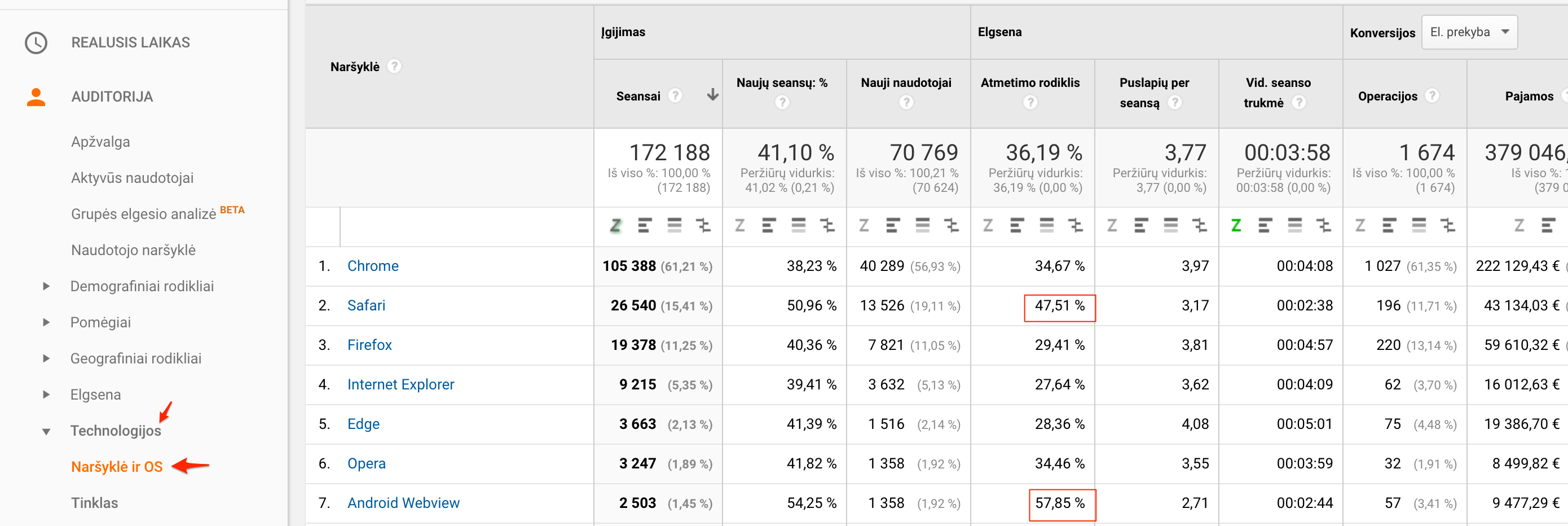 Matome, kad šioje vietoje Safari naršyklės atmetimo rodiklis aukštesnis už kitus. Bet generuojama vertė gan didelė. Kas būtų jei jums pavyktų sumažinti atmetimo rodiklį iki kitų naršyklių lygio?