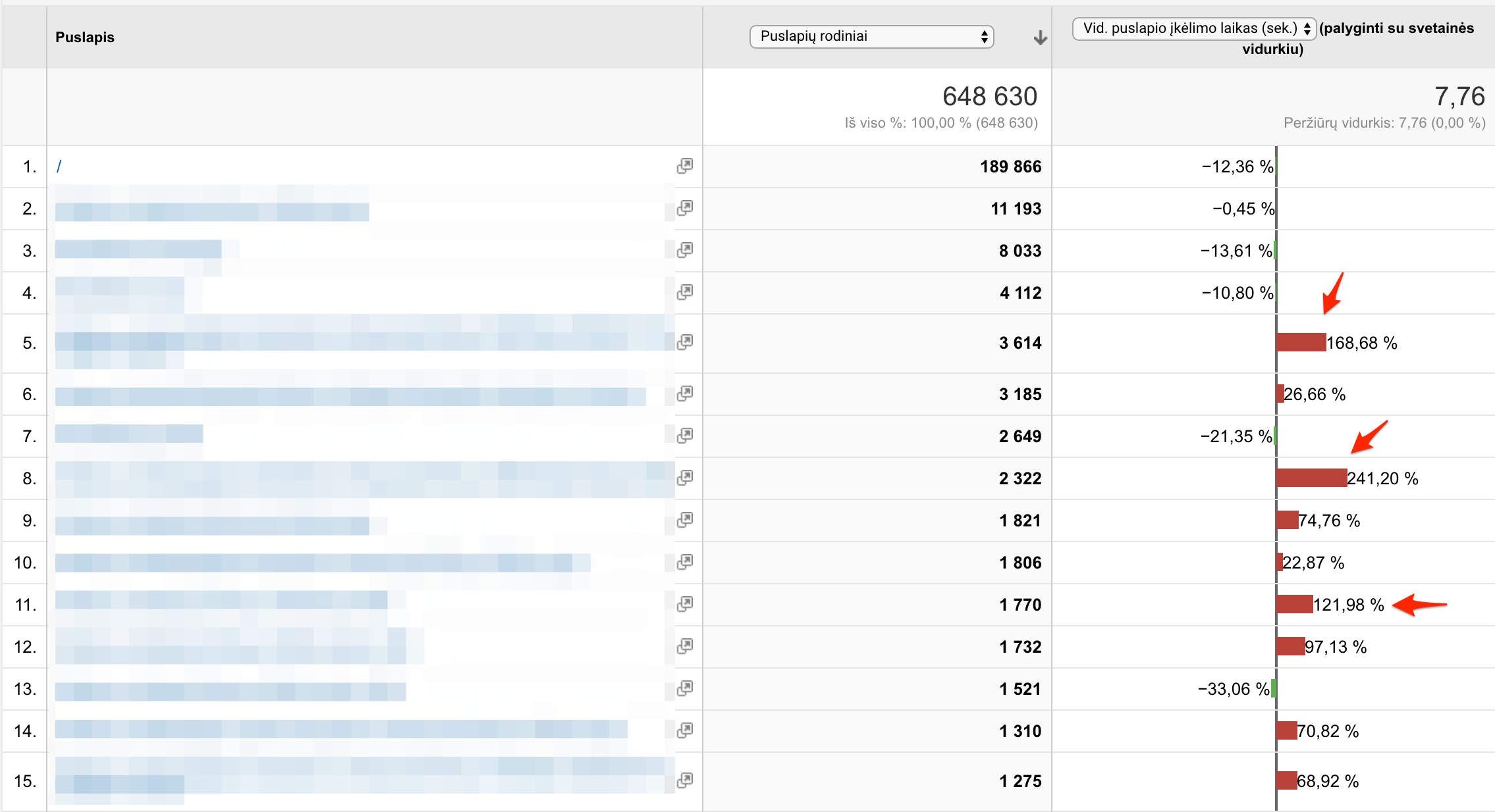 Pradėkite nuo TOP 10 ar TOP 20 savo puslapių. Peržiūrėkite juos visus, gal pamatysite dalykus, siejančius juos kartu.