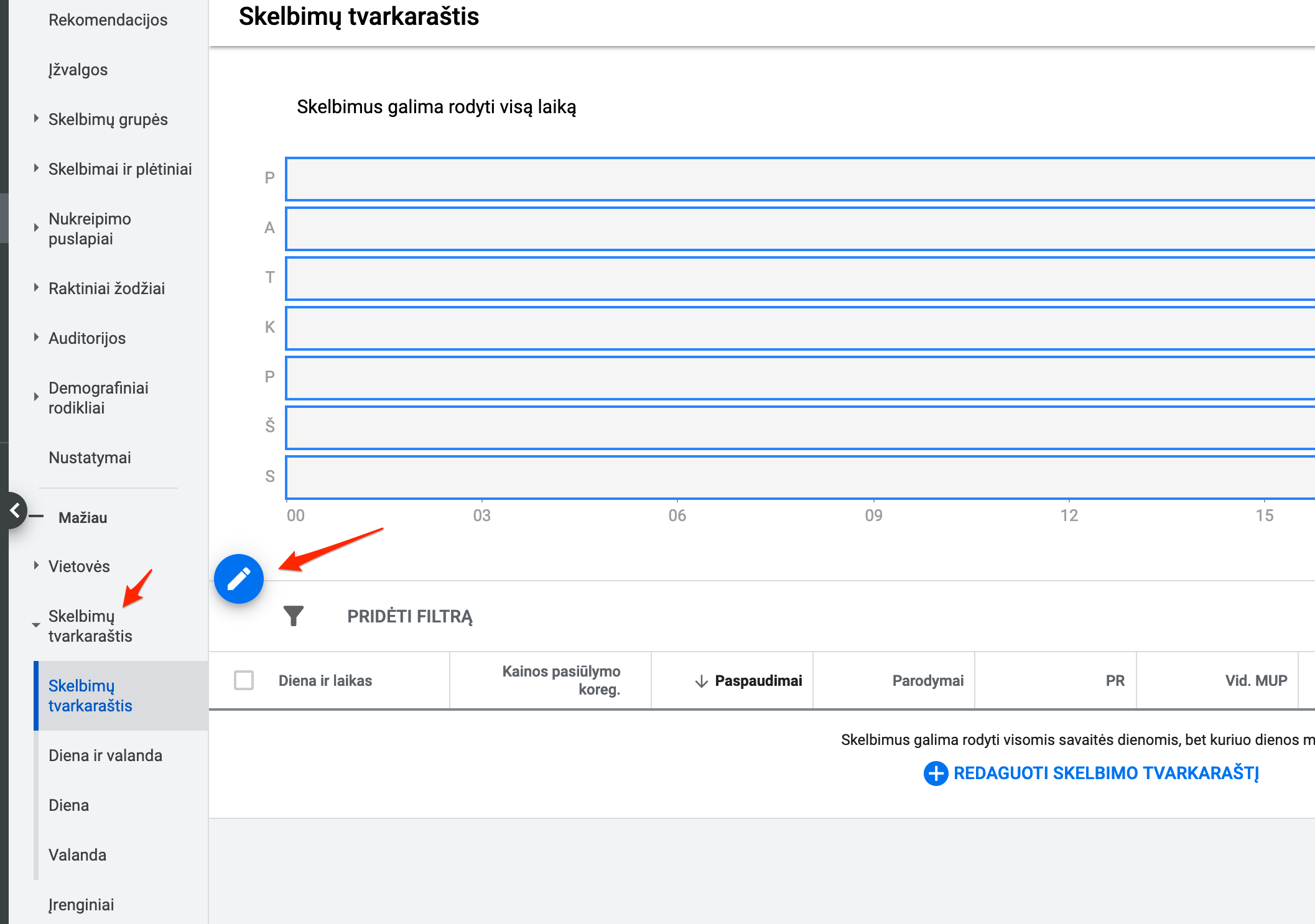Pridėti arba išimti tam tikras dienas labai paprasta. Pasirinkite norimą kampaniją, per vidurį pamatysite meniu (pilkas fonas). Ten suraskite skelbimų tvarkaraštis ir paspauskite Užeikite. Spauskite mėlyną mygtuką ir galėsite pasirinkti dienas ir laikus, kada skelbimas rodomas.